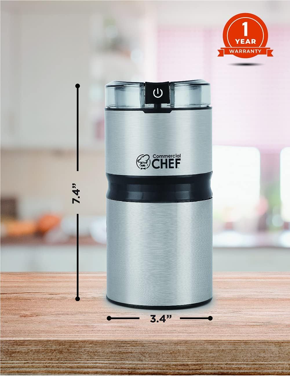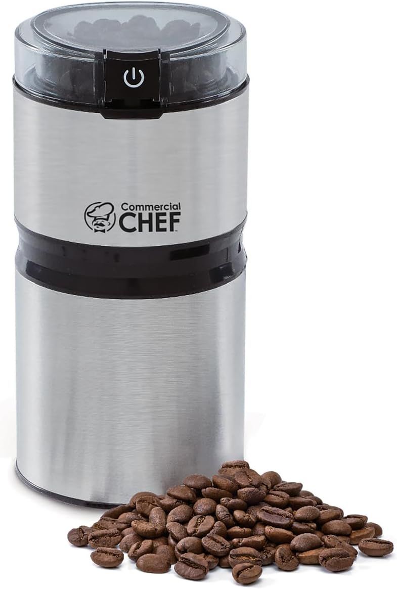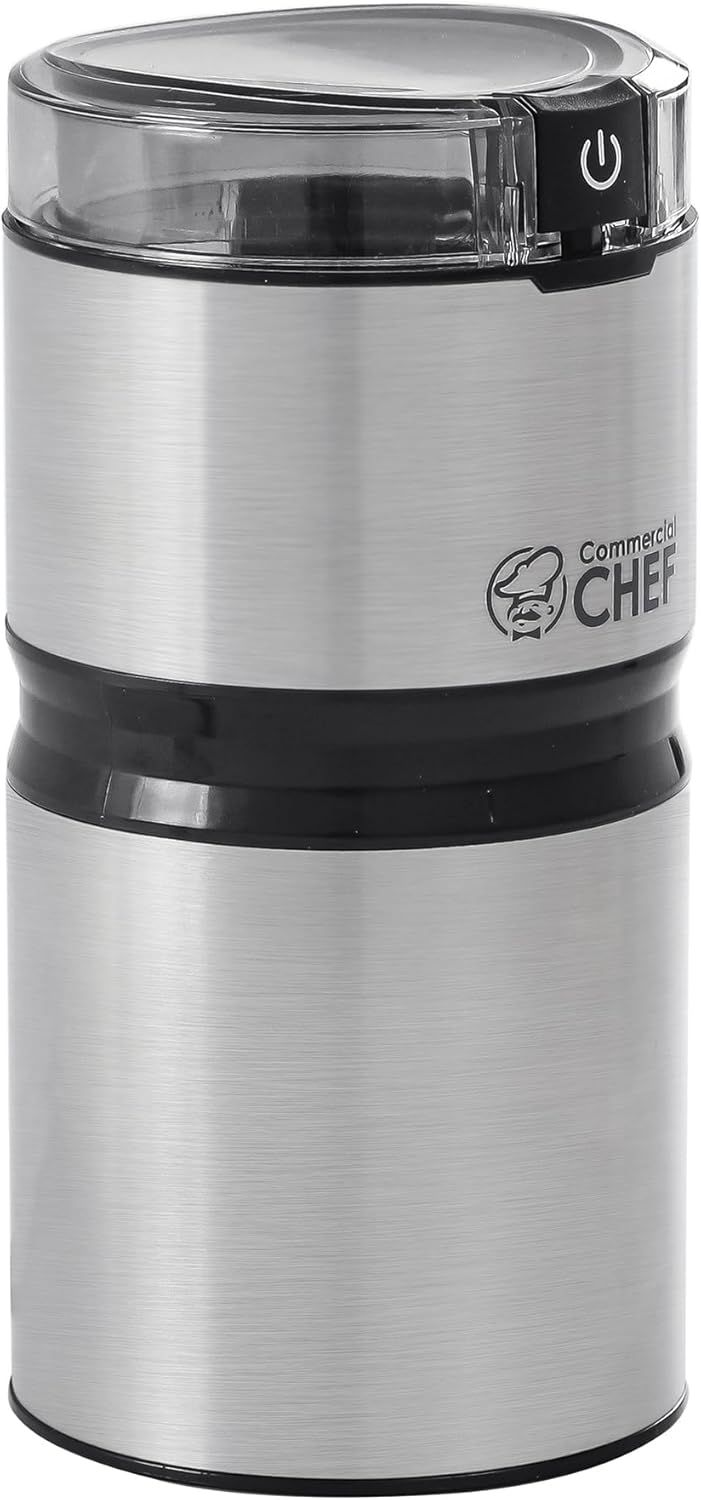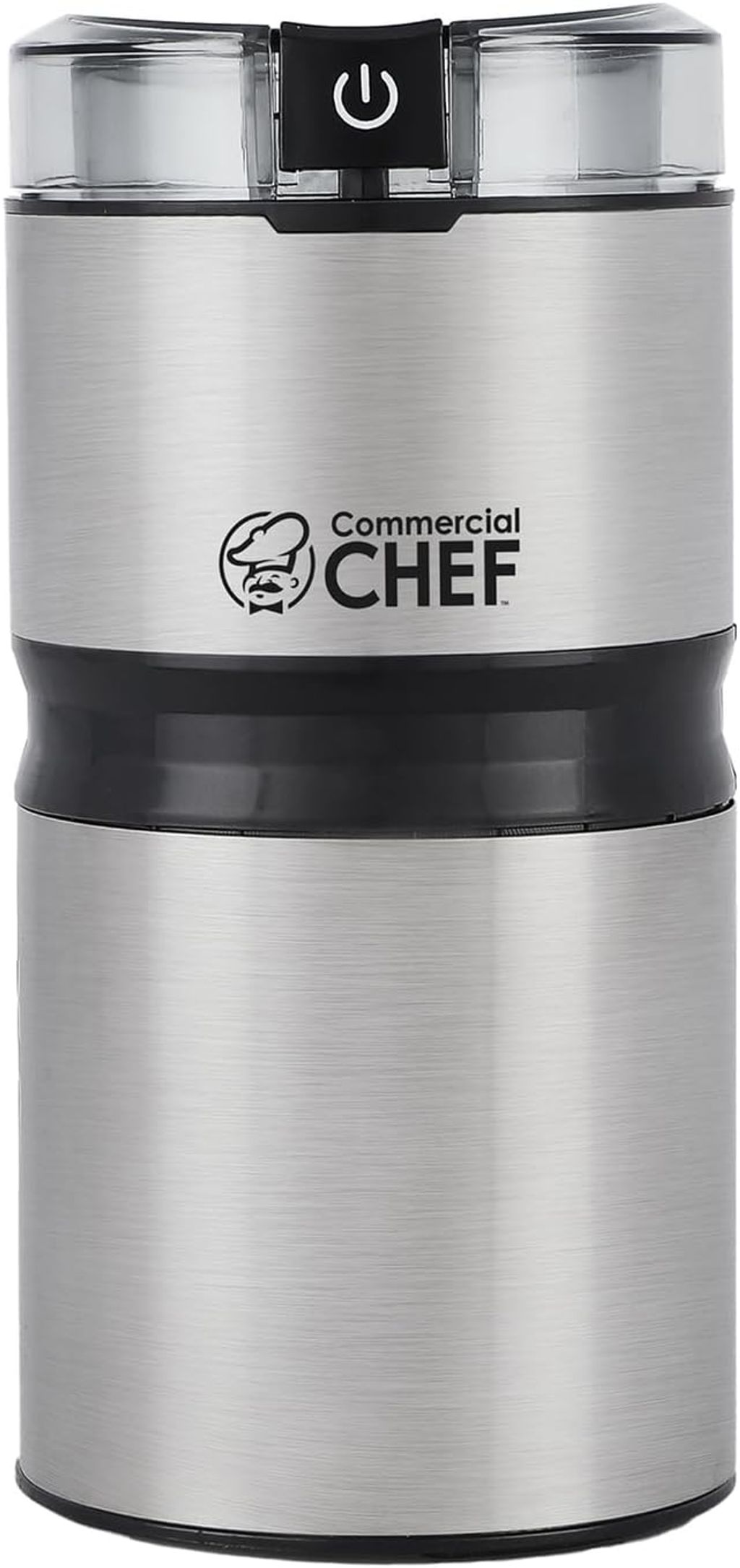Grind whole beans for your favorite brewed coffee with the Commercial Chef Coffee Grinder. This 2.1-oz. large-capacity grinder features 1-touch push-button control so you can quickly create the ideal consistency. Use it also for grinding herbs, spices, and grains, or chopping nuts and seeds.